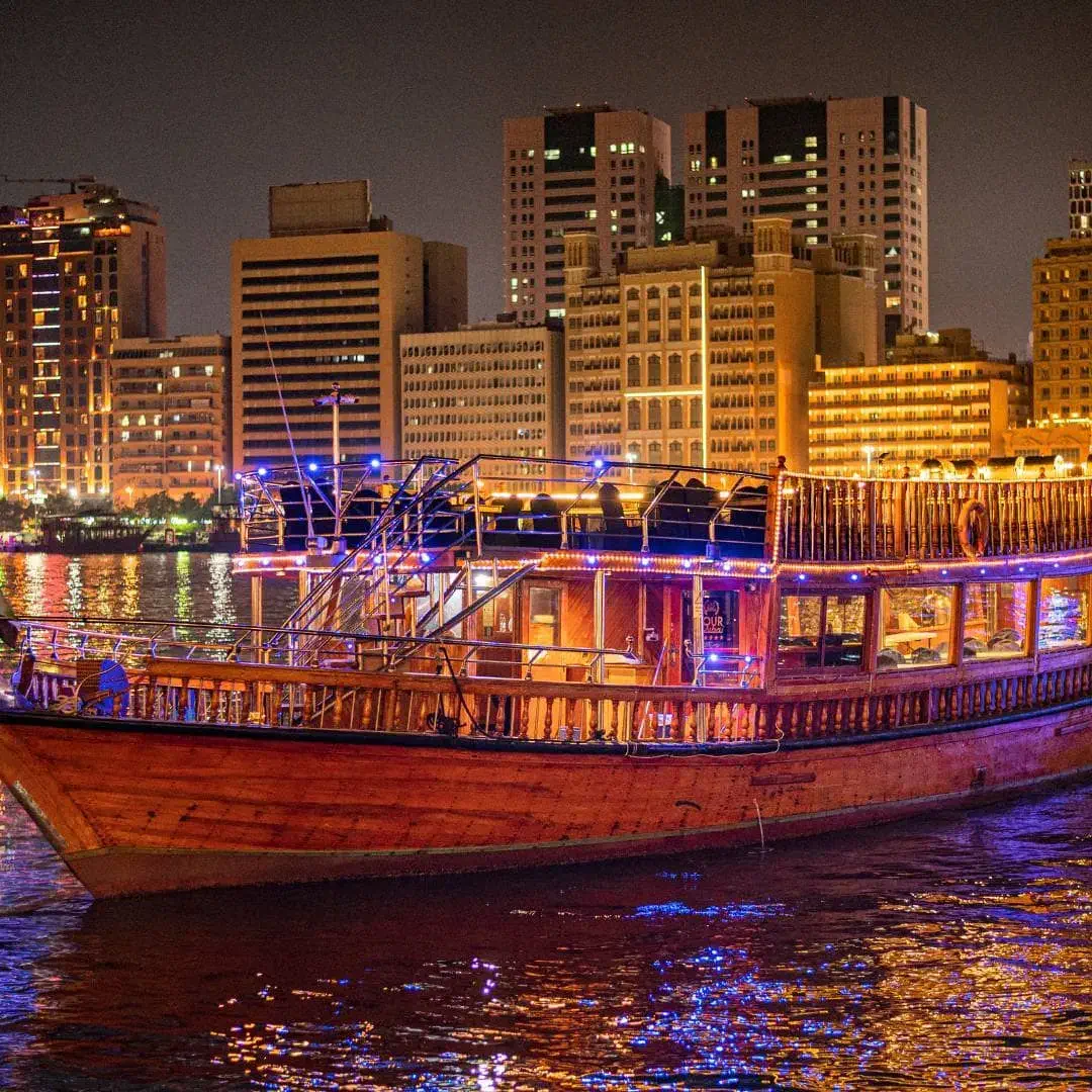Step aboard a beautifully decorated wooden dhow and experience Dubai’s rich heritage from the water. As you cruise past the glittering skyline of Old and New Dubai, enjoy a lavish buffet dinner featuring international and Arabic delicacies. Live entertainment such as traditional Tanoura dance and soothing background music enhance the ambiance, making it a perfect evening for couples, families, or groups.