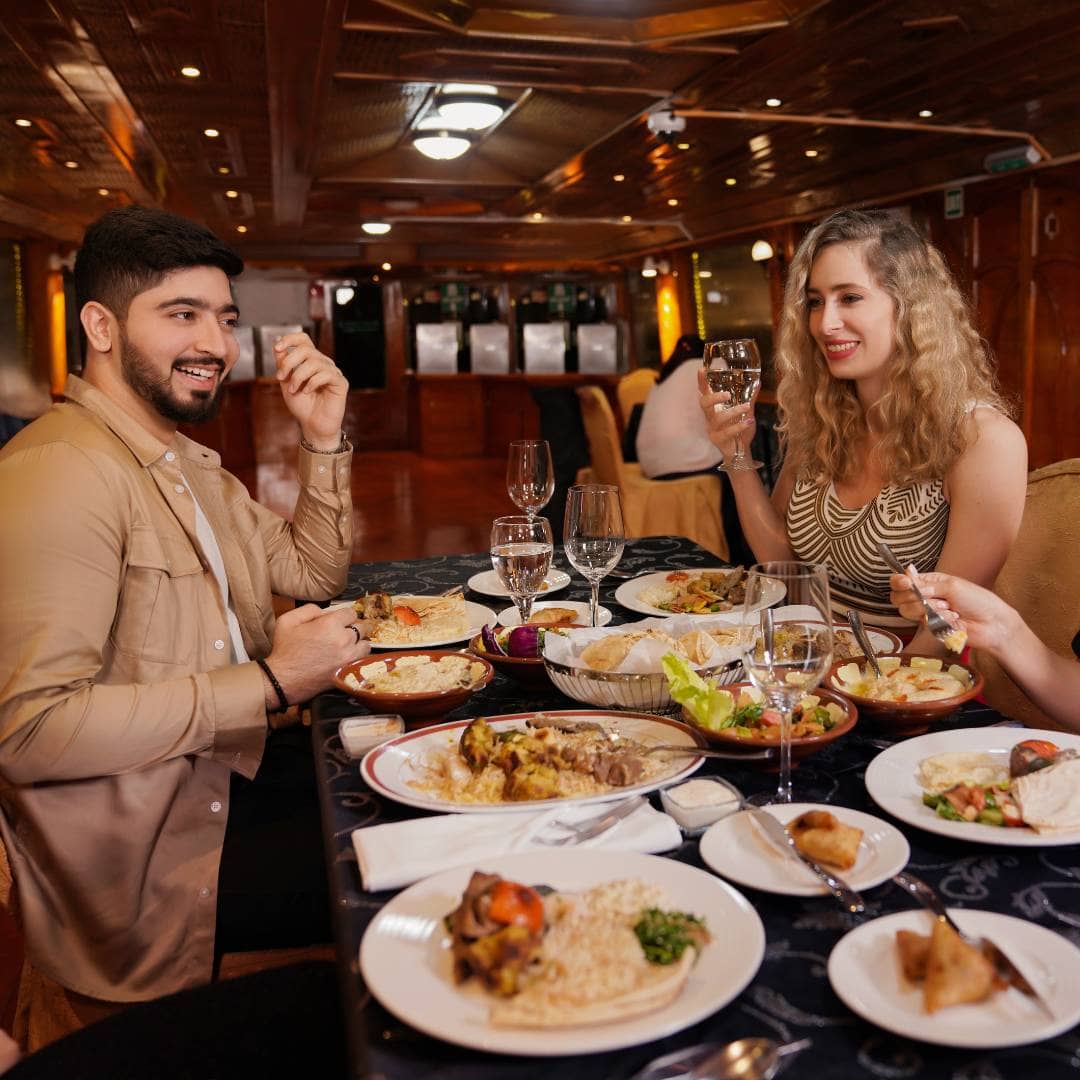 Enjoy a serene evening as you cruise along the historic Dubai Creek aboard, taking in views of both old-world charm and modern cityscapes. The experience offers an authentic Emirati atmosphere, enhanced by elegant décor and warm hospitality. Cultural entertainment, including a mesmerizing Tanoura dance performance and soft background music, adds to the enchantment of the night. With shared transfers included from anywhere within Dubai city, this experience ensures a hassle-free and memorable outing. Perfect for couples, families, and groups, the Royal Dinner Cruise promises an unforgettable blend of heritage, comfort, and charm.