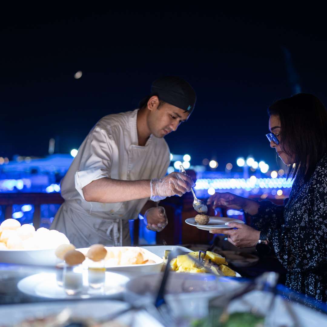 Spice up your evening with bold flavors, stunning skyline views, and Dubai Marina’s famous light show. This Indian Cuisine Dinner Cruise is a vibrant cultural experience that blends traditional dishes, scenic cruising, and seamless shared transfers for a night to remember.