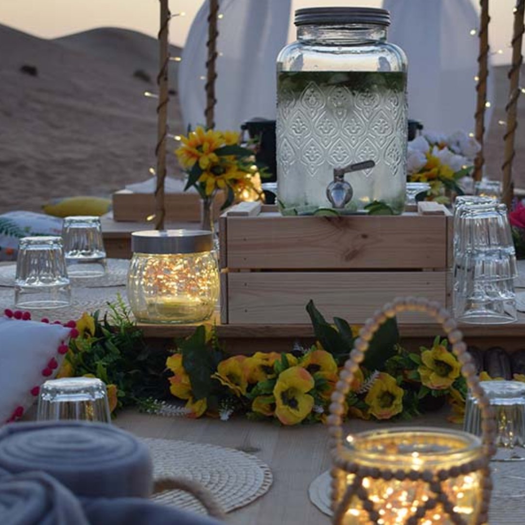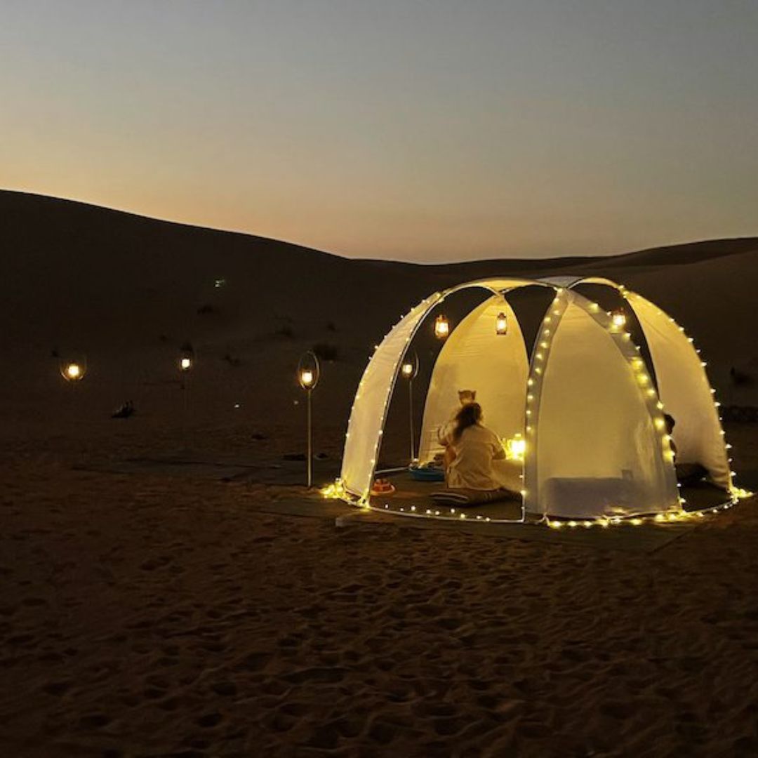 As the sun sets over the dunes, enjoy unlimited sandboarding, a cozy campfire with marshmallows, and a BBQ dinner tailored to your preferences. Sip on welcome drinks, tea, coffee, and soft beverages as you soak in the peaceful desert ambiance. This is a carefully curated experience where every detail is designed to make your evening feel exclusive and magical.