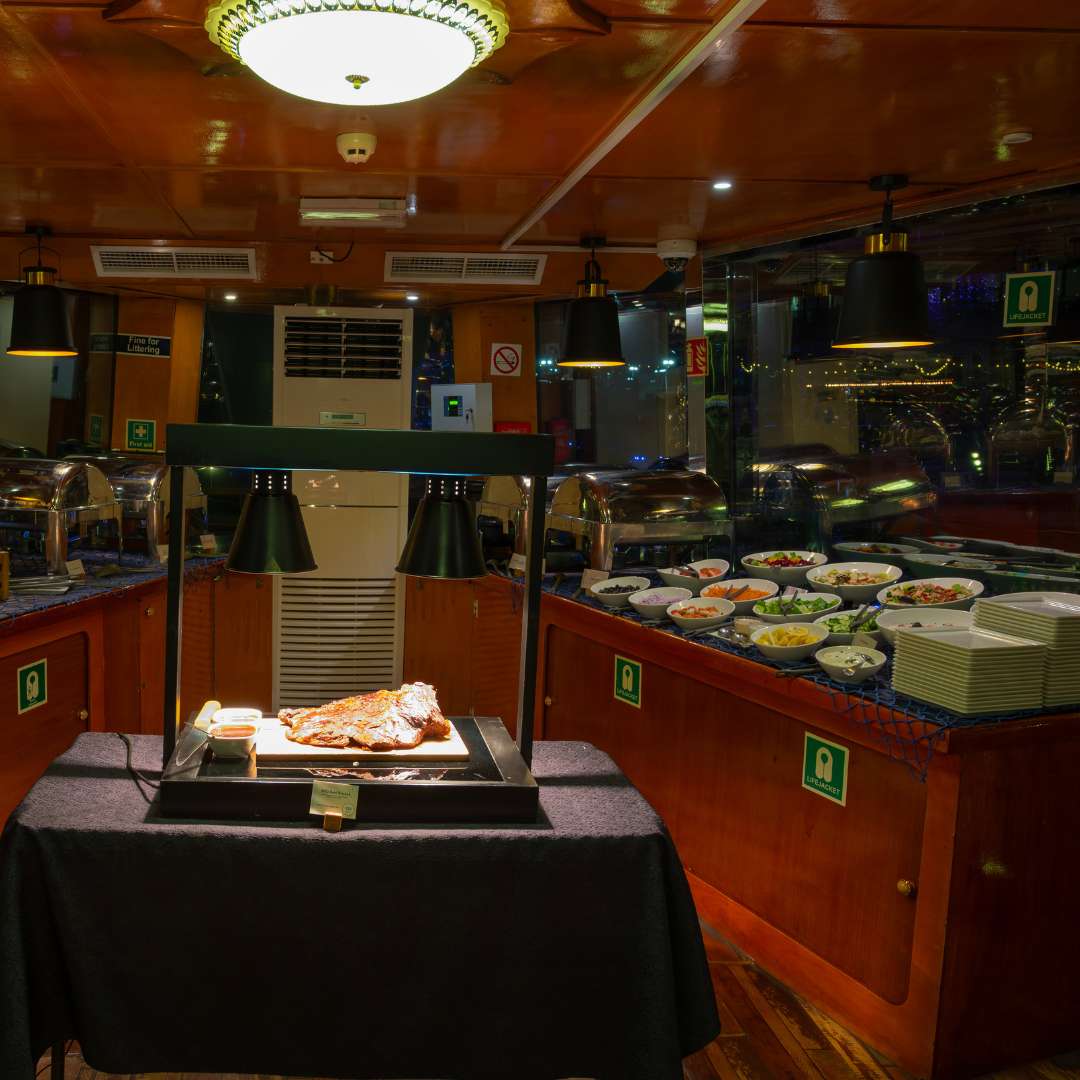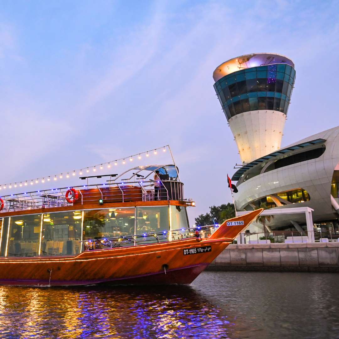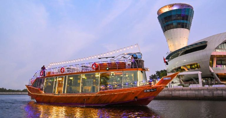 Prepare for an enchanting evening as you cruise the tranquil waters surrounding Yas Island, home to world-famous attractions like Yas Marina Circuit and Ferrari World. Onboard the traditional yet luxurious dhow, you’ll be greeted with welcome drinks before indulging in a lavish international buffet featuring both Arabic and continental dishes. Live entertainment, soft ambient music, and stunning views of the island’s skyline under the night sky make this an unforgettable evening. Whether you’re celebrating or simply unwinding, this experience combines culture, comfort, and class.