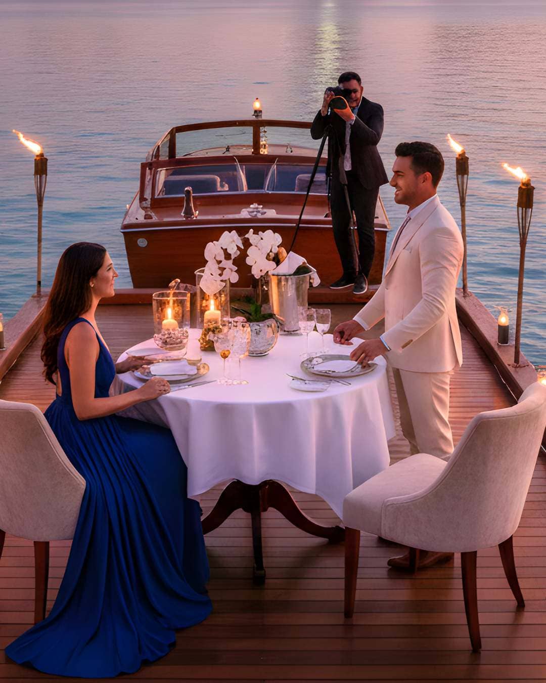Arrive to your private table, illuminated by torches, with the Palm Jumeirah as your breathtaking backdrop. Indulge in a specially curated five-course set menu chosen just for you. Your magical evening will be captured on camera, creating a keepsake you’ll cherish for a lifetime. Here’s what’s included: